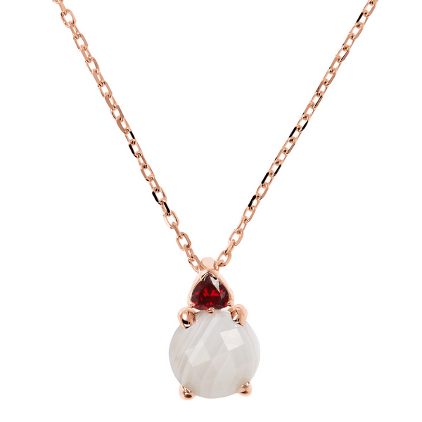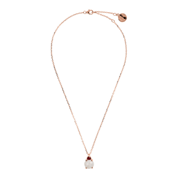 Collana Bronzallure realizzata in lega Golden Rosé, placcata oro rosa 18kt, con catena forzatina allungata e ciondolo impreziosito da una pietra naturale dalla forma tondeggiante e da un cuore in cubic zirconia, qualità luminosa; chiusura a moschettone e lunghezza regolabile da tre anelli (41 cm / 43 cm / 47 cm).