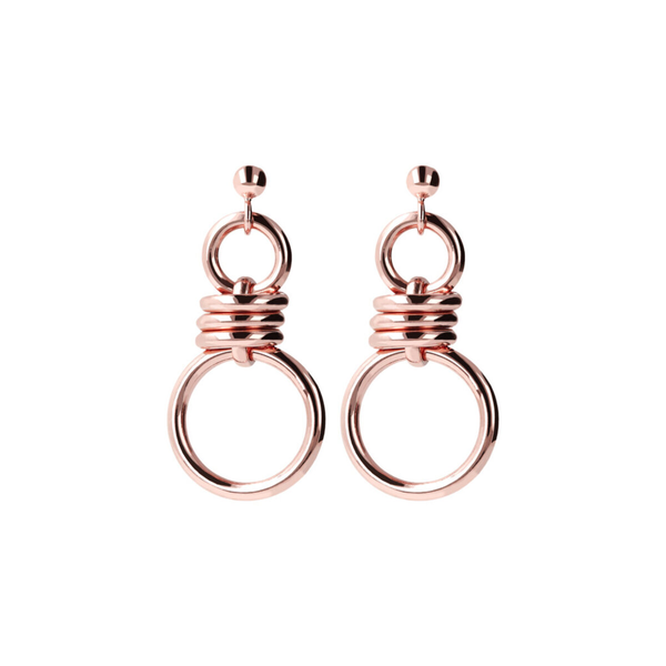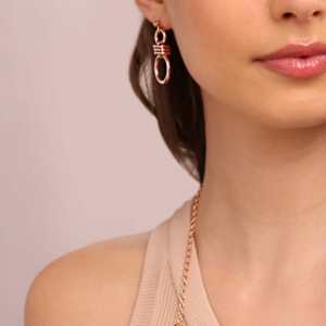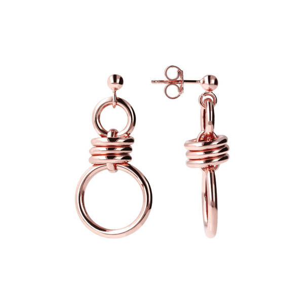 Orecchini pendenti Bronzallure realizzati in lega Golden Rosé, placcati oro rosa 18kt a doppio anello con nodo; chiusura a perno e farfalla; lunghezza di 3.6 cm.