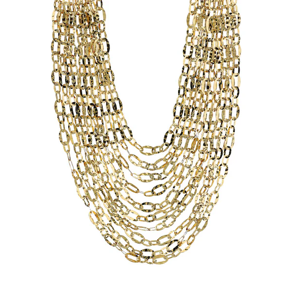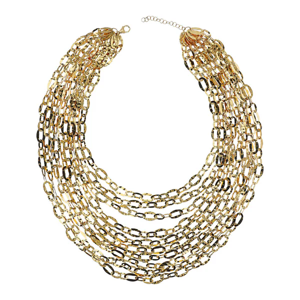 Collana multi-filo Etrusca Gioielli realizzata in lega Golden, placcata Oro giallo 18kt, con 10 file graduate di maglie ovali martellate. Lunghezza 56+x cm di estensione. Chiusura a moschettone.