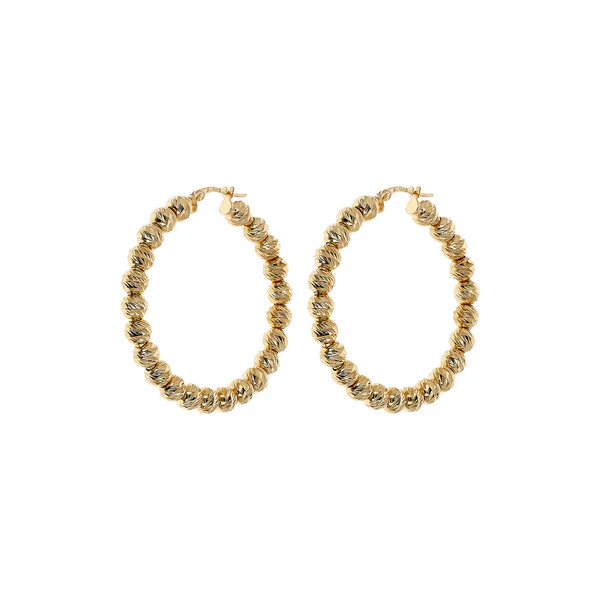 Orecchini a cerchio Etrusca Gioielli realizzati in lega Golden, placcata Oro giallo 18kt, con bead diamantate (5 mm). Chiusura a baionetta. Diametro esterno 4 cm.