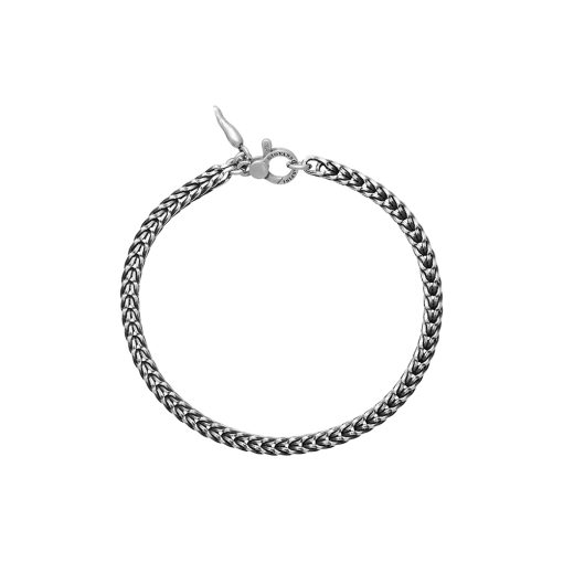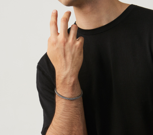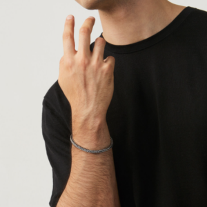 Una catena che diventa creazione contemporanea. La classica maglia a treccia viene qui rivisitata conferendole una sezione quadrata, che accentua le geometrie del gioiello. Un luminoso bracciale in argento per un uomo dalle mille anime.