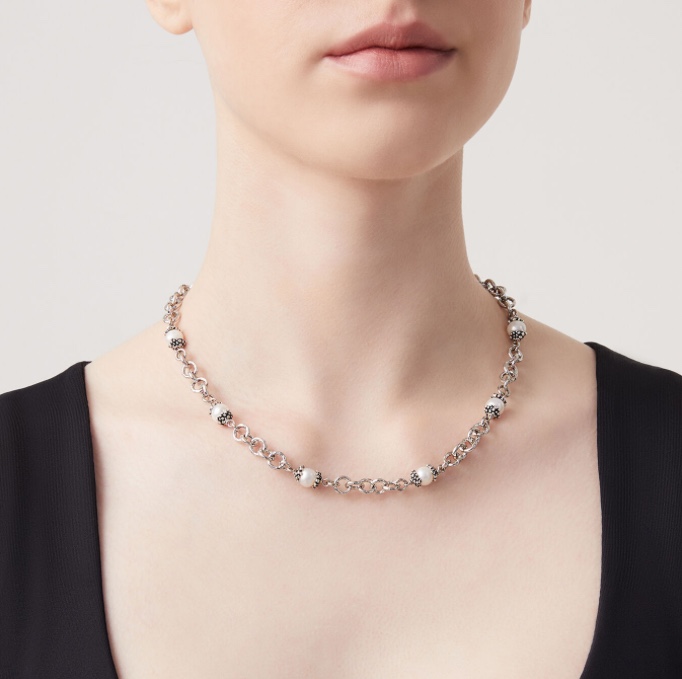 Delicate perle di acqua dolce, incastonate da luminose sferette in argento brunito, sono le protagoniste di questa collana. Gli inserimenti in catena martellata offrono matericità al gioiello, che viene realizzato completamente a mano in azienda.