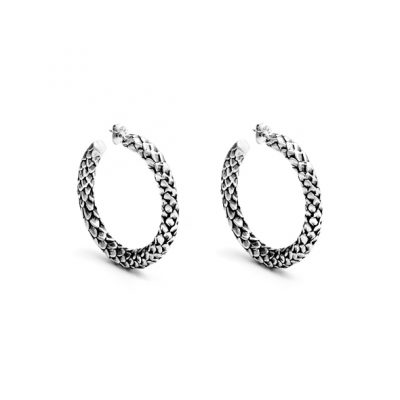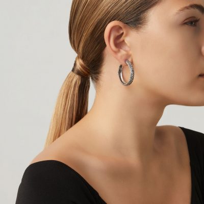 Gli orecchini Cerchio Serpente regalano texture di argento brunito e scaglie lucenti di serpente. Il tema stilistico figurativo viene interpretato in termini contemporanei, realizzando un gioiello luminoso e dal fascino astratto.