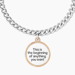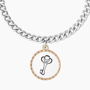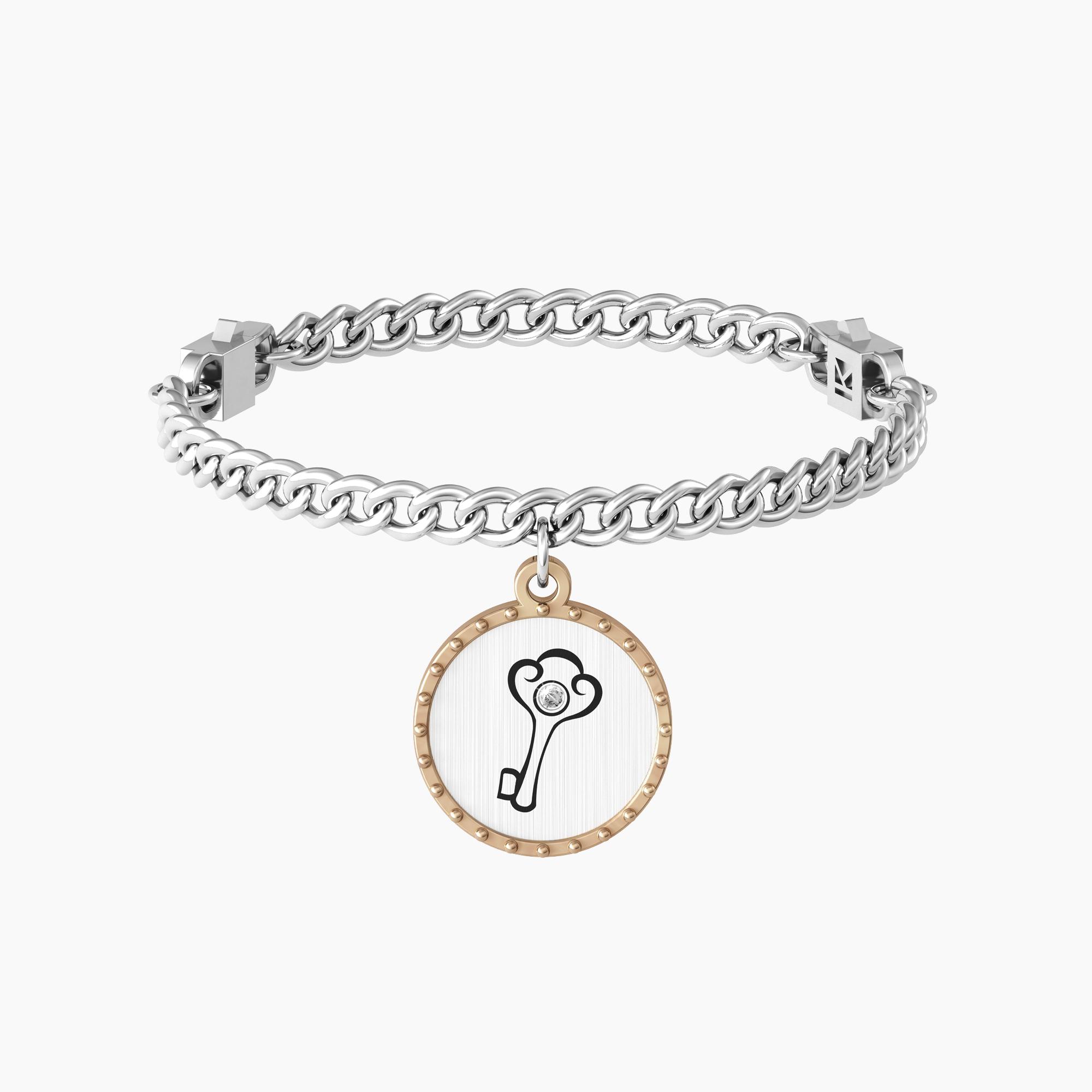Bracciale in acciaio con catena groumette “comfort fit” e ciondolo satinato tondo con rifinitura borchiata color oro rosa e cristallo.