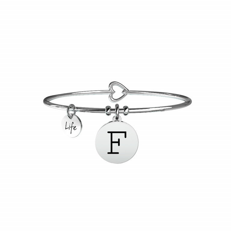 - Bangle in acciaio con ciondolo tondo con lettera F.