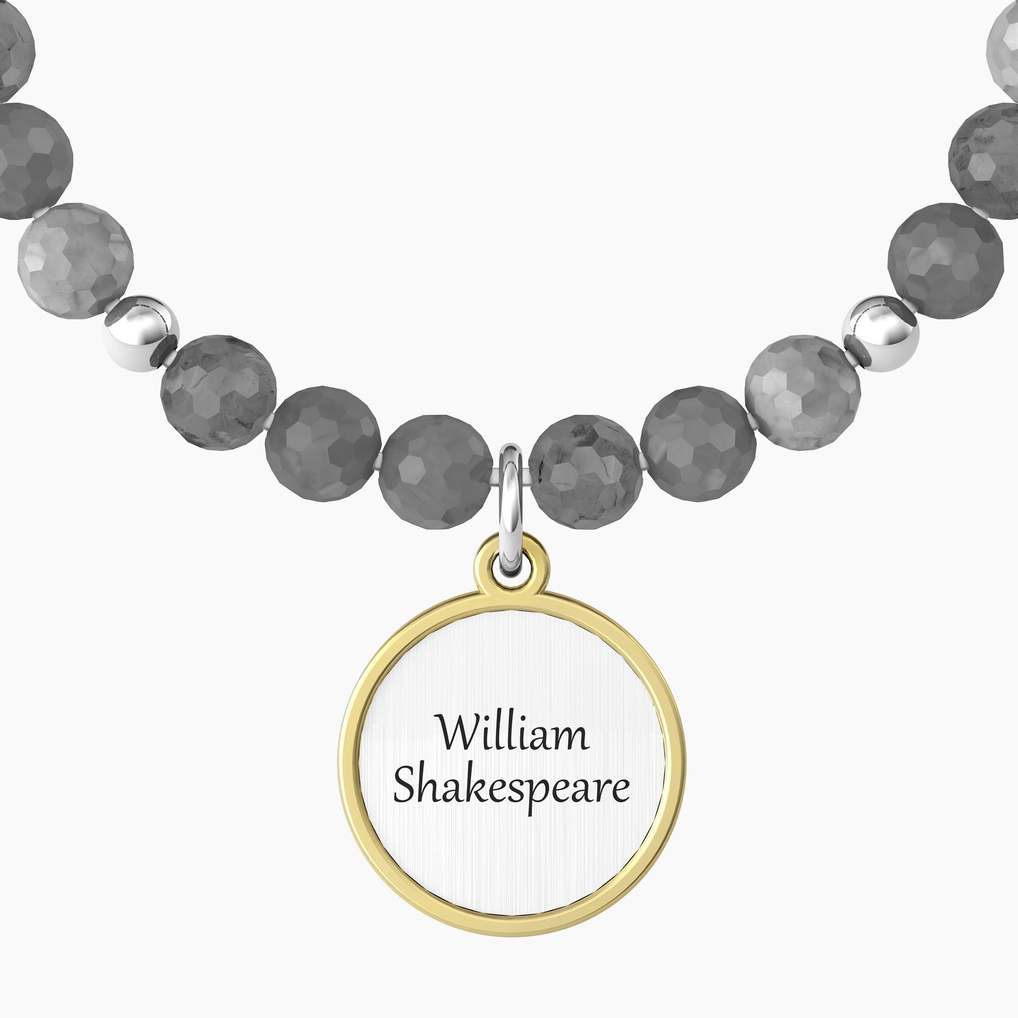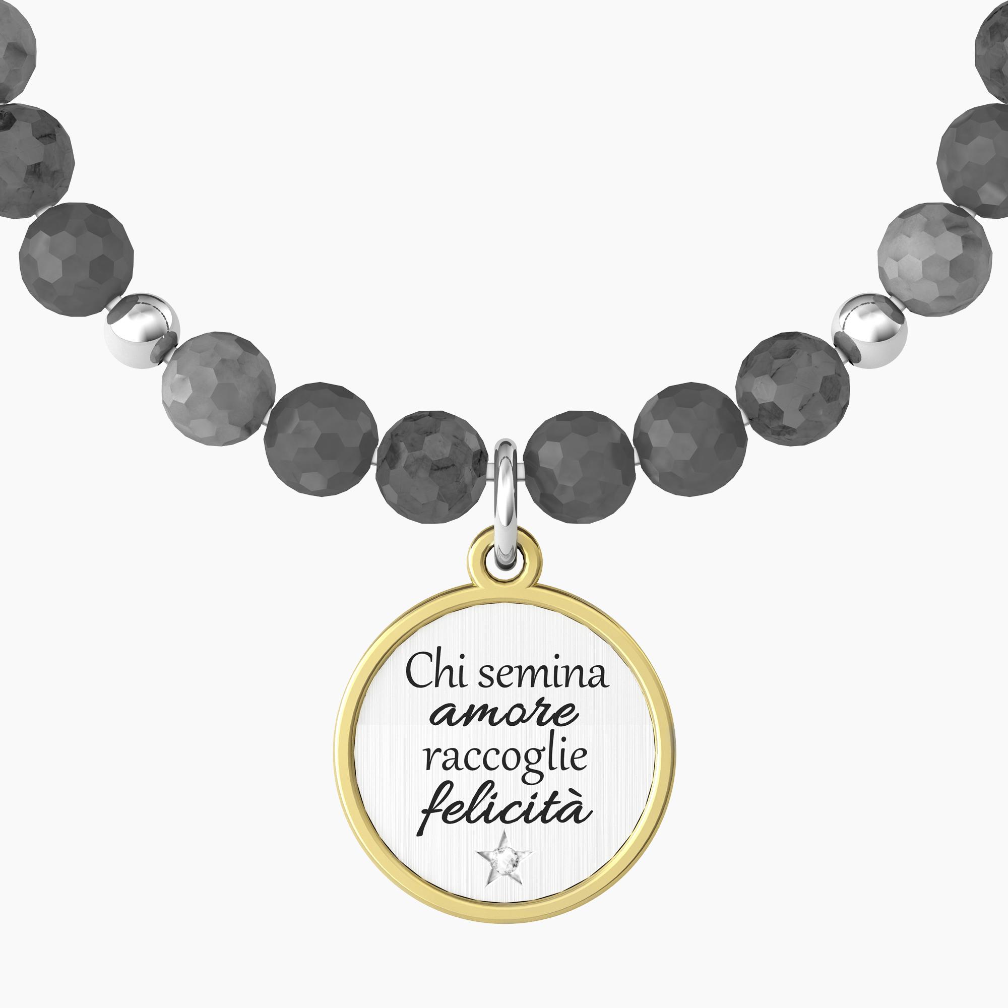 Bracciale elastico con sfere in labradorite e ciondolo satinato tondo con rifinitura color oro giallo. Dettaglio in cristallo sul fronte e incisione smaltata su fronte e retro. Citazione di William Shakespeare: “Chi semina amore raccoglie felicità”.
