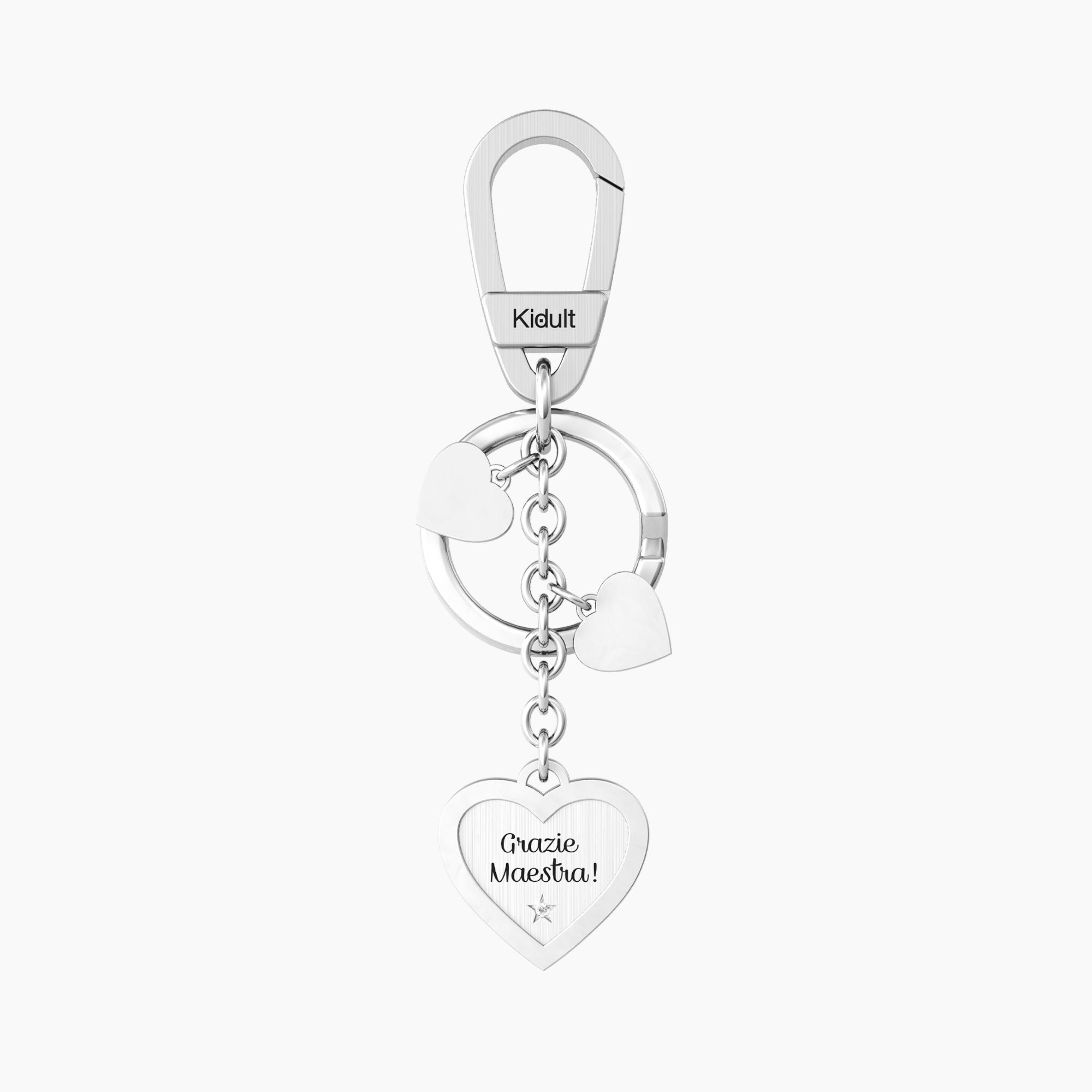 Portachiavi in acciaio satinato con ciondoli piccoli a forma di cuore e ciondolo grande a forma di cuore con cristallo e scritta “Grazie Maestra!”.