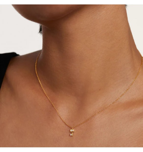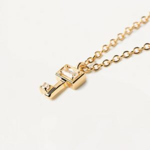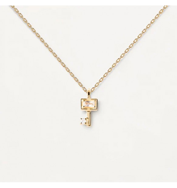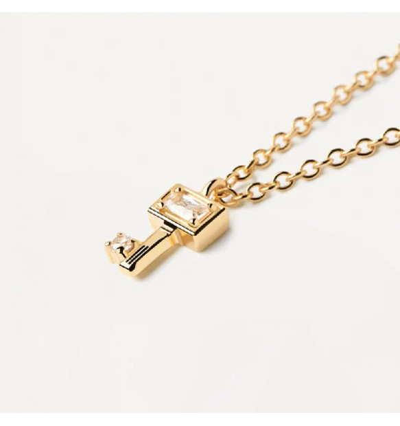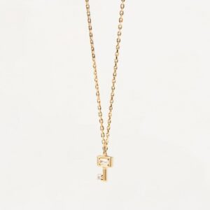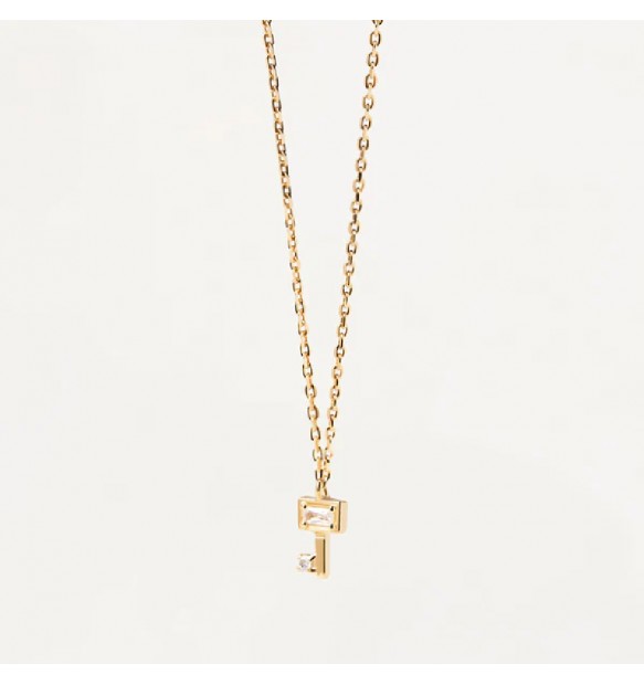 Collana da donna realizzata in argento 925% con finitura dorata. Pendente a forma di chiave dalle dimensioni di 9,5 mm x 4,5 mm impreziosito da zirconi bianchi dalle dimensioni di 1,5 mm x 1,5 mm e 3 mm x 1,5 mm. Ha una lunghezza totale di 50 cm, regolabile fino a 40 cm. Ha un peso di circa 1,97 g.