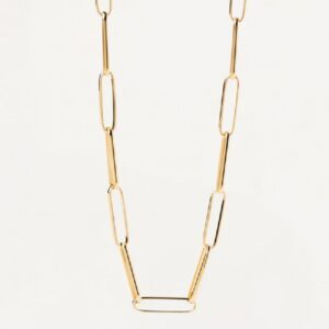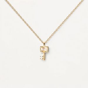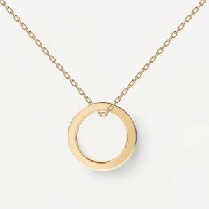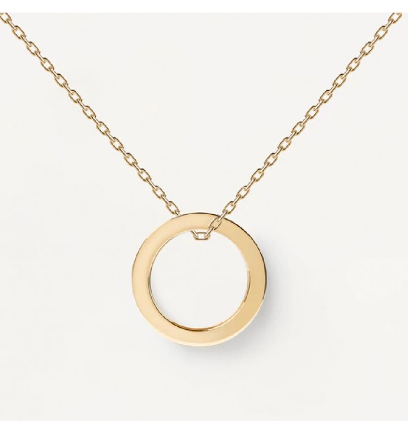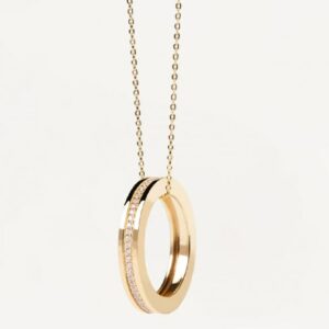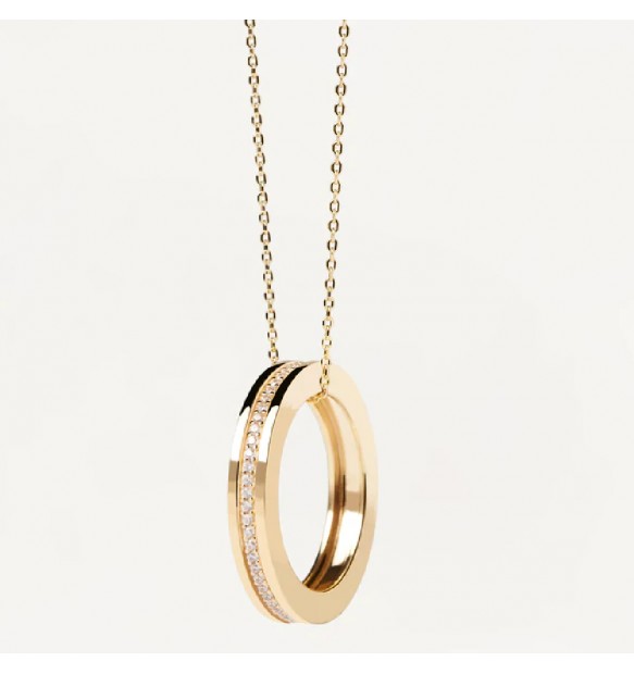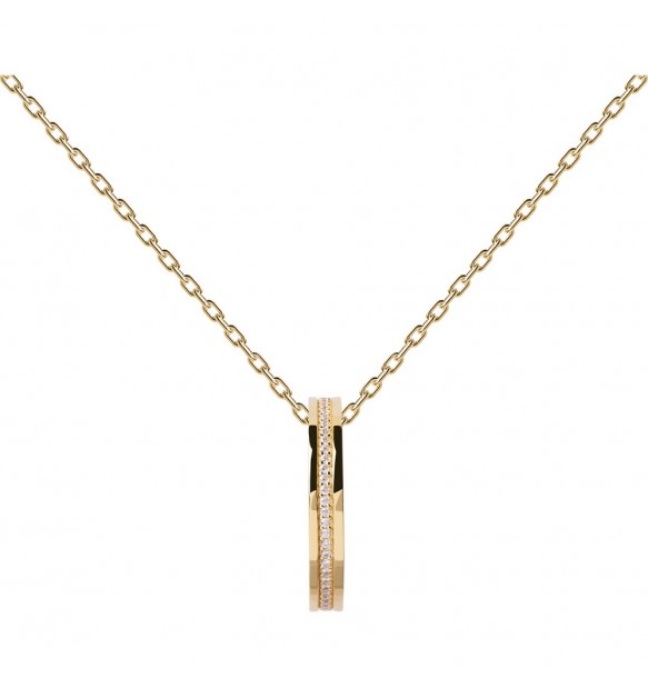 Collana da donna realizzata in argento 925% con finitura in oro 18kt. Anello pendente impreziosito lateralmente da zirconi bianchi dal diametro di 1 m. Ha lunghezza totale di 50 cm, regolabile fino a 40 cm. Ha peso di circa 6,5 g.