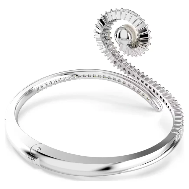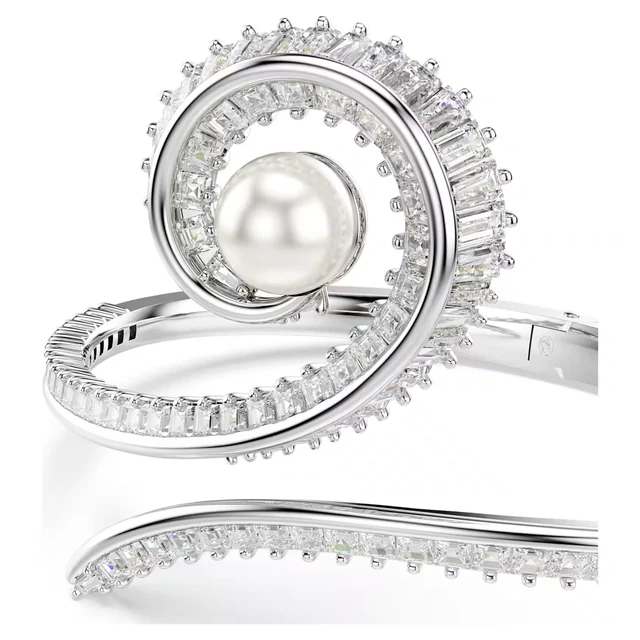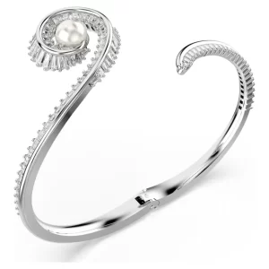 Questo bangle ispirato alla musica combina eleganza e creatività. Ispirato alla forma astratta di una chiave di violino, il design placcato rodio è splendidamente avvolto a spirale e impreziosito da Swarovski Zirconia taglio Baguette. Per un ulteriore tocco di lusso, una singola Crystal Pearl Swarovski è posizionata al centro. Il modo perfetto per donare al tuo stile un’infusione allegra e ritmica.
