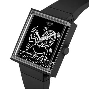 La cassa quadrata nero opaco del BIOCERAMIC è dotata di un vetro biosourced edge-to-edge che offre una vista laterale del modello bianco stampato sul quadrante. Il quadrante nero quadrato presenta lancette color argento fosforescenti a forma di freccia per le ore e i minuti e una lancetta dei secondi color argento. Il quadrante e la cassa sono completati da un cinturino biosourced integrato nero opaco, con passante biosourced e fibbia BIOCERAMIC abbinati. Il copribatteria nero opaco con stampa bianca sul retro raffigura il logo Swatch creato da Keith Haring.