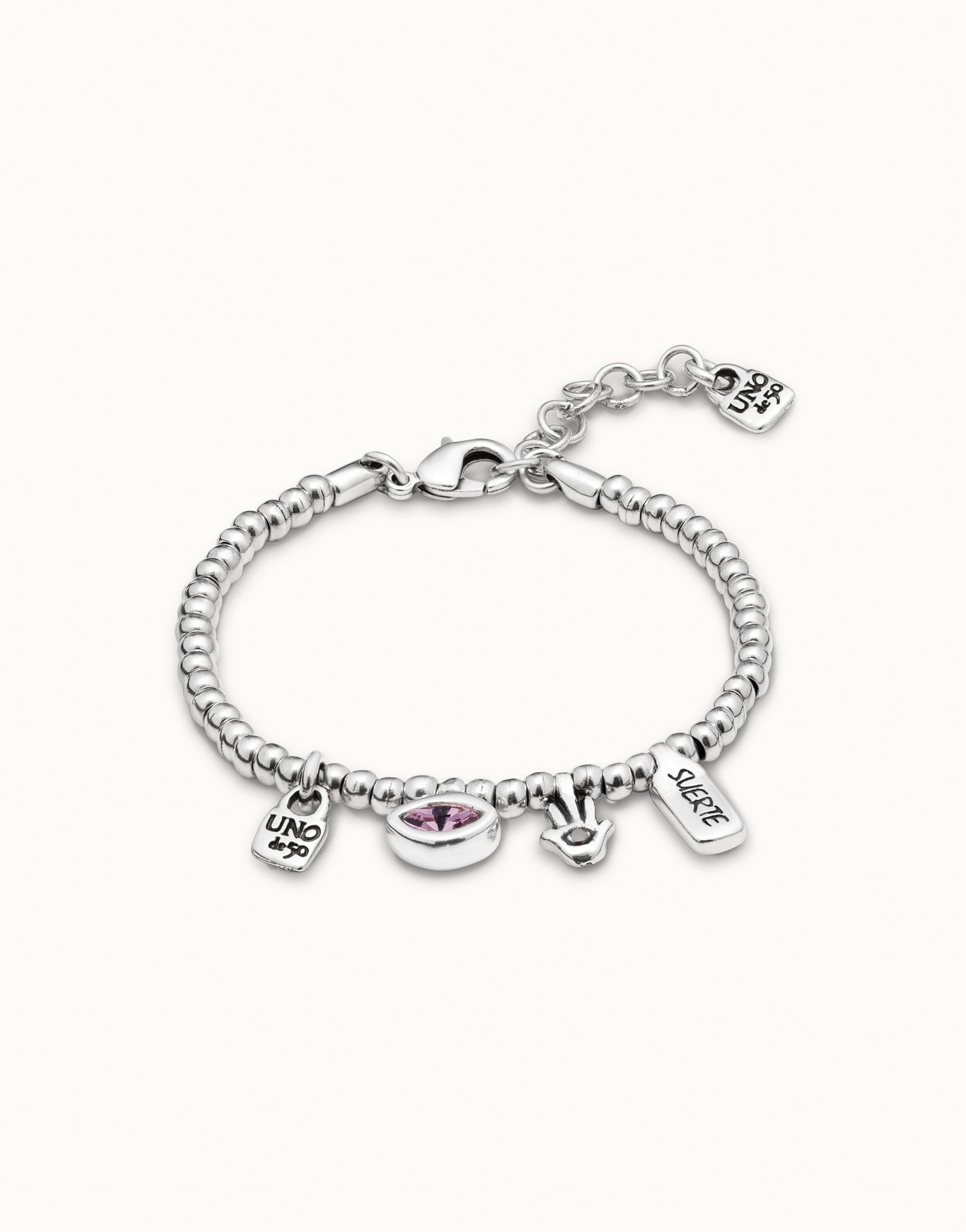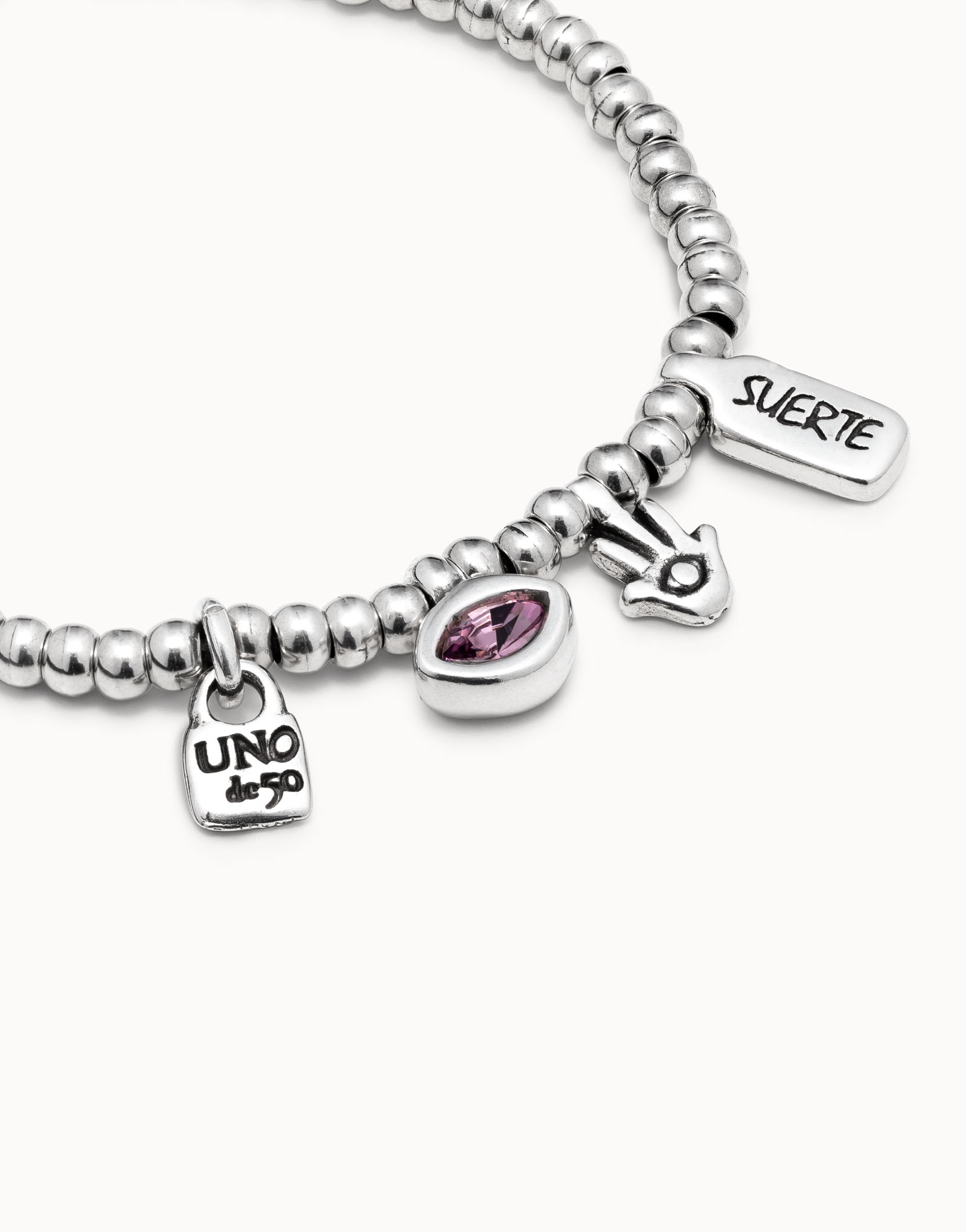 Ispirato al misticismo delle culture arabe, questo bracciale bagnato nell’argento è costituito da vari pezzi perlati da cui sono appesi tre ciondoli: il lucchetto proprio di UNOde50, un medaglione ovale con cristallo SWAROVSKI® ELEMENTS e la misteriosa Mano di Fatima, portatrice di protezione e fortuna. Realizzato in Spagna da UNOde50 secondo un procedimento artigianale. COD. PUL1853PINK