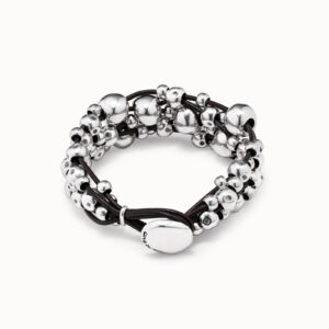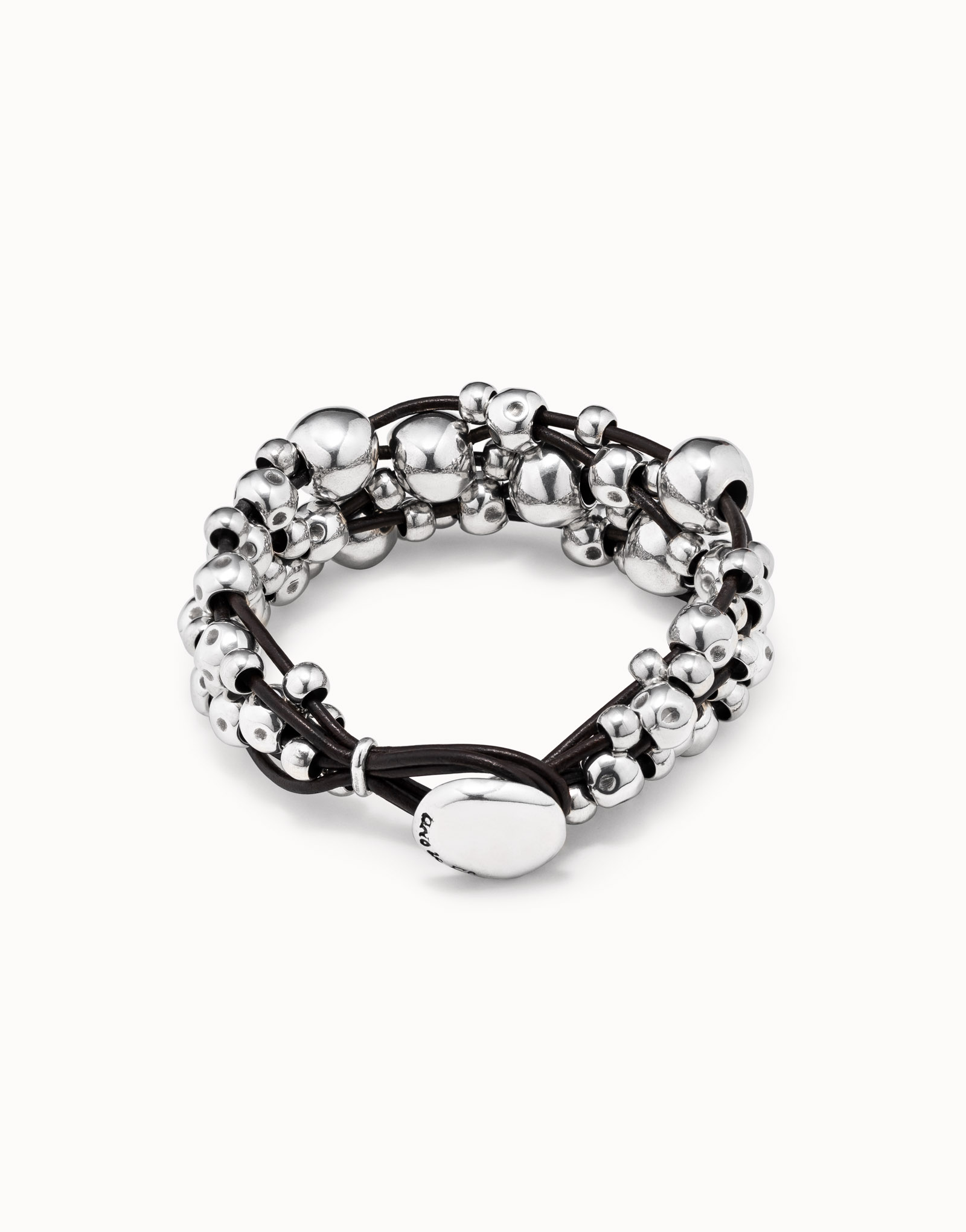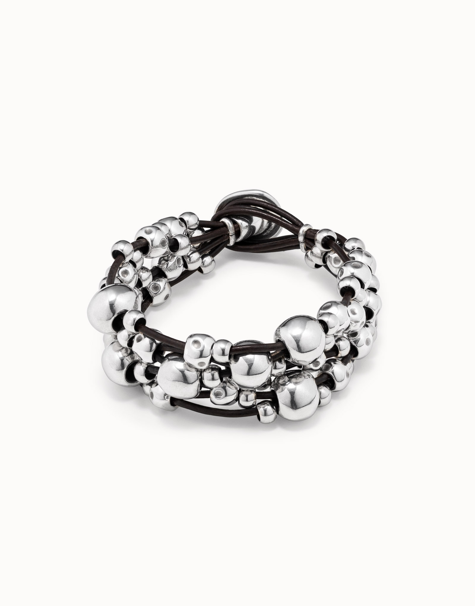 Bellissimo bracciale con tripla striscia di pelle marrone che unisce più pietre a forma di perla di diverse dimensioni bagnate nell’argento. Il pezzo presenta una semplice e originale chiusura ed è indicato per un look più casual. Indossa questo gioiello realizzato interamente a mano in Spagna. Articolo nr: PUL1861